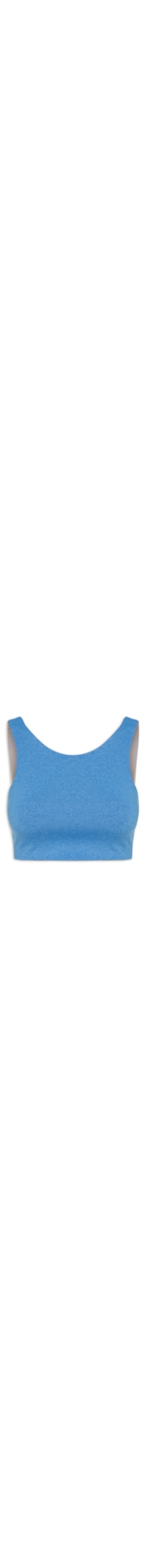 O top azul é confeccionado em malha. A peça possui decote frontal redondo e posterior V profundo transpassado, alças médias, cavas regulares, forro, bojo, comprimento cropped*, shape justo, caimento reto e acabamento pespontado.