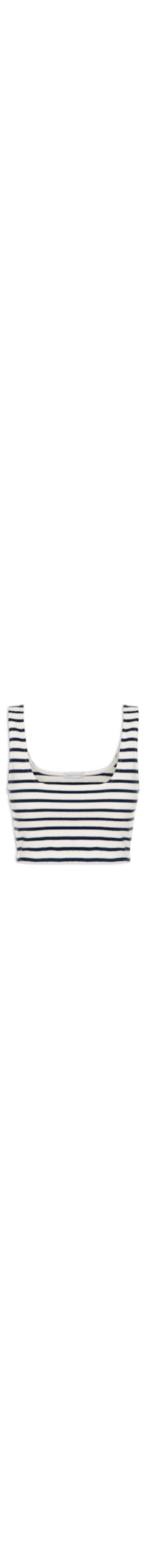 O cropped* off white é confeccionado em malha 100% algodão. A peça possui decote profundo em U, cavas laterais, padronagem listrada em azul, elástico inferior, acabamento atoalhado, acabamento pespontado e shape solto.