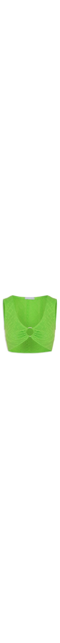 O top verde é confeccionado em tricot. A peça possui decote u com aplicação de argola em metal, detalhe frontal franzido, alças largas, cavas regulares, comprimento cropped, shape solto, caimento reto e acabamento canelado.