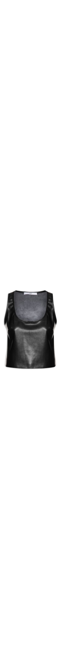 O top preto é confeccionado em material sintético. A peça possui decote U, alças médias, cavas regulares, pences na altura do busto, comprimento cropped*, shape solto, caimento reto e acabamento pespontado.