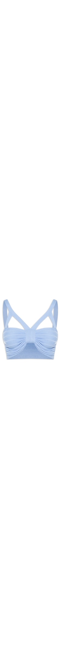 O top azul é confeccionado em tricot. A peça possui decote v, recortes vazados acima do busto, alças finas, detalhe de franzido, comprimento cropped, shape justo, caimento reto e acabamento canelado.