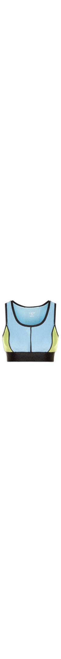 O top azul é confeccionado em malha cirrê com média elasticidade. A peça justa ao corpo possui decote frontal em U e posterior nadador, alças médias, logo da marca estampado na parte posterior em material refletivo, recortes em tons contrastantes, barra com elástico embutido, forro, sem bojo e comprimento cropped*.