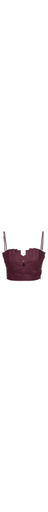 O top vinho é confeccionado por linho sem elasticidade. A peça justa ao corpo possui decote coração estilizado, alças finas com ajuste por botão, recorte na altura do busto frontal com pregas, recorte vazado frontal, recorte posterior em lastex, fechamento lateral por zíper lateral e comprimento cropped*.