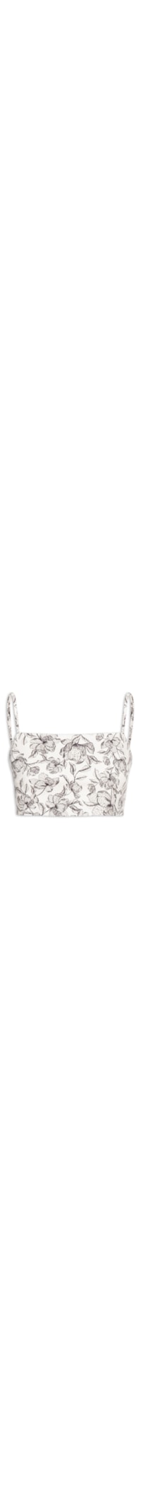 O top branco é confeccionado em tecido leve com média elasticidade. A peça solta ao corpo possui decote reto, alças finas com regulagem na parte posterior, lastex aplicado na parte posterior, estampa floral em cor contrastante, comprimento cropped* e fechamento posterior por zíper.
