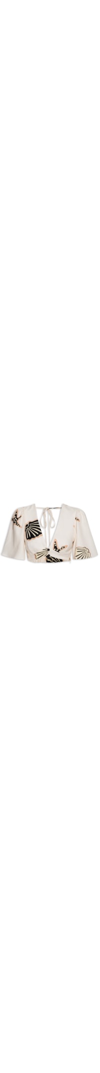 O top bege é confeccionado em tecido leve com toque de linho sem elasticidade. A peça solta ao corpo possui decote V, mangas curtas amplas, forro, recorte posterior vazado com cordões alongados para amarração, recorte posterior com elásticos embutidos, pences frontais, mix de estampas em cores contrastantes, botões aplicados na parte frontal e comprimento cropped*.