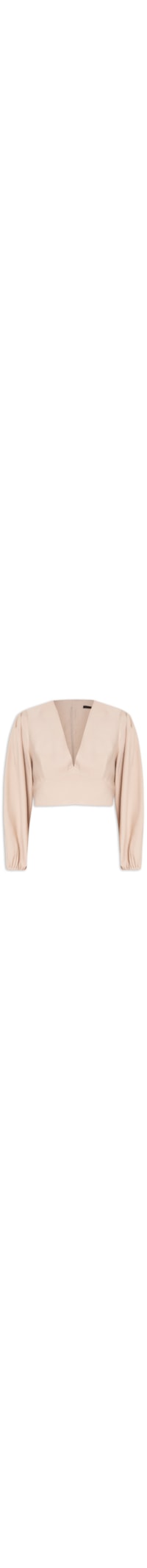O top bege é confeccionado em tecido leve sem elasticidade. A peça solta ao corpo possui decote V profundo, mangas 7/8 com elástico embutido nos punhos, pences e recortes no busto, comprimento cropped* e fechamento posterior por zíper invisível.