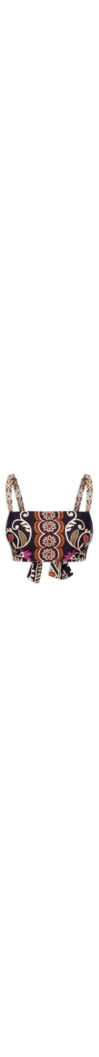 O top preto é confeccionado em tecido leve sem elasticidade. A peça justa ao corpo possui decote reto, alças finas com regulagem na parte posterior, mix de estampas em cores contrastantes, comprimento cropped* e fechamento posterior por amarração.