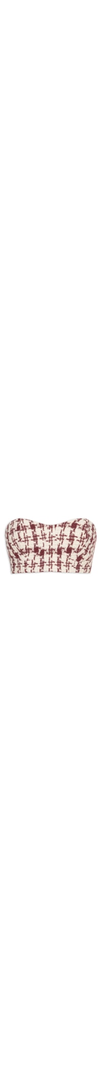 O top off white é confeccionado em tweed sem elasticidade. A peça justa ao corpo de modelo tomara que caia possui decote coração, sem bojo, forro, comprimento cropped*, padronagem pied de poule em cor contrastante vermelho e fechamento posterior por zíper.