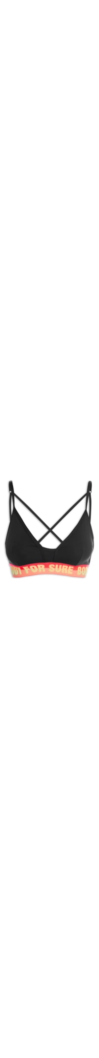 O top preto é confeccionado em malha de poliamida. A peça de modelo triângulo possui decote V, alças finas reguláveis, tiras finas cruzadas na parte posterior, bojo removível, pences na parte frontal do busto, recorte elástico na altura da barra com nome da marca em cores contrastantes, forro, comprimento cropped* e shape justo.
