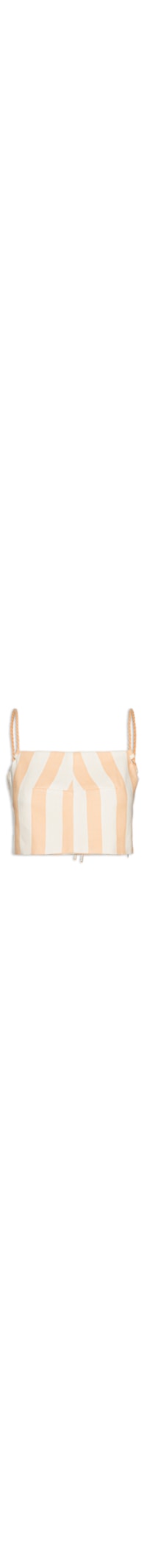 O top off white é confeccionado em tecido leve com toque de linho sem elasticidade. A peça solta ao corpo possui decote reto, alças finas trançadas, alongadas e reguláveis por amarração posterior, pence frontal, sem bojo, padronagem listrada na cor laranja, comprimento cropped*, forro e fechamento lateral por zíper invisível.