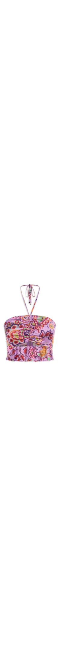 O top rosa é confeccionada em tecido leve. A peça possui decote tomara caia, alças finas, cavas regulares, recorte vazado na parte frontal, detalhe de franzido na parte frontal, cordão embutido na parte frontal, elástico embutido abaixo do busto, mix de estampas em cores contrastantes, comprimento cropped, shape justo, caimento reto, acabamento pespontado e fechamento posterior por zíper.
