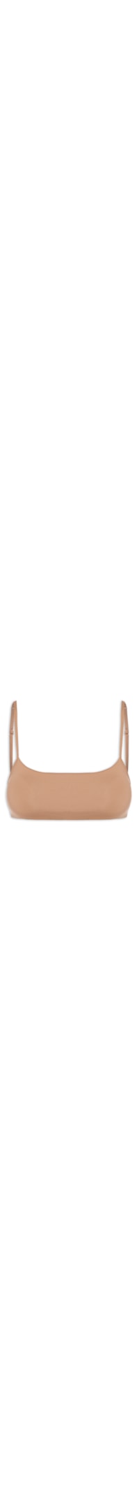 O top bege é confeccionado em malha de poliamida com alta elasticidade. A peça justa ao corpo possui decote reto, alças finas ajustáveis, bojo removível e tag da marca aplicada na parte posterior.