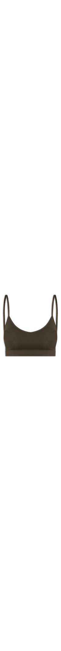 O top marrom é confeccionado em malha de poliamida com alta elasticidade. A peça justa ao busto possui decote em V, alças finas fixas, ombros descobertos, caimento ajustado, acabamento interno com forro no corpo e barra reta com elástico embutido para sustentação.