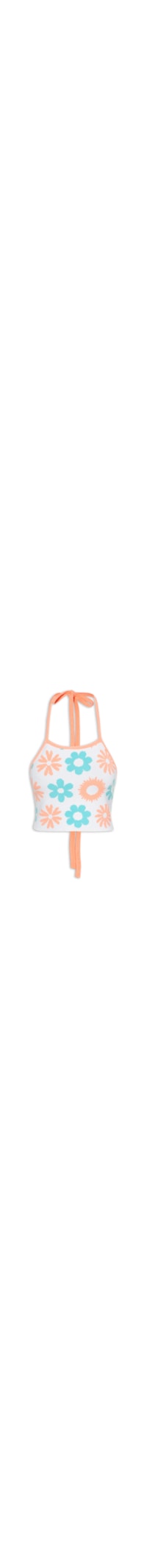 O top laranja é confeccionado em tricot. A peça de modelo frente única possui decote U, alças finas, padronagem floral em cores contrastantes, comprimento cropped*, shape justo, caimento reto, acabamento canelado e fechamento posterior por amarração.