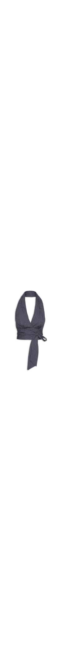 A blusa azul é confeccionada em tecido leve sem elasticidade. A peça solta ao corpo possui decote V profundo, alças médias, detalhe vazado na parte posterior, padronagem de listras na cor branca, comprimento cropped*, tiras alongadas aplicadas no busto para ajuste frontal por transpasse e amarração lateral.