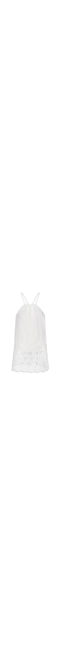 O top branco é confeccionado em tecido leve com superfície texturizada sem elasticidade. A peça solta ao corpo possui decote trapézio com detalhes de franzidos, alças em tiras finas estendidas para amarração com ponteiras miçangas, leve transparência e barra com bordados richelieus.