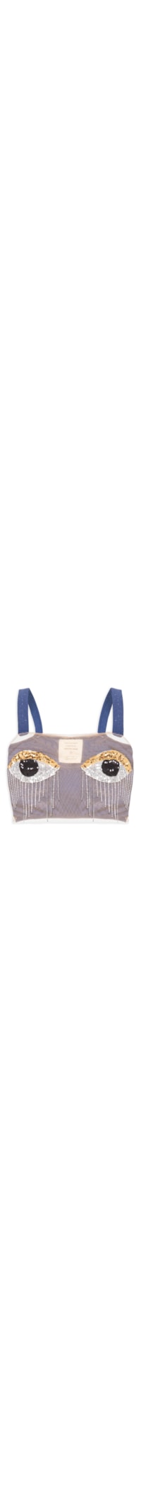 O top azul é confeccionado em tecido leve com baixa elasticidade. A peça justa ao corpo possui decote reto, alças médias, parte frontal em tela com aplicação de paetês e pedrarias, alças e parte posterior com aplicação de lurex e comprimento cropped*.