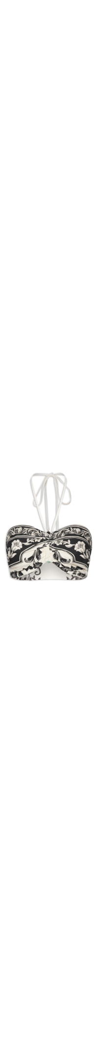 O top branco é confeccionado em tecido leve com toque de linho sem elasticidade. A peça justa ao corpo possui decote coração com detalhes de franzidos, tiras finas estendidas para amarração posterior, recortes posteriores com lastex embutidos, mix de estampa na cor preto e forro.