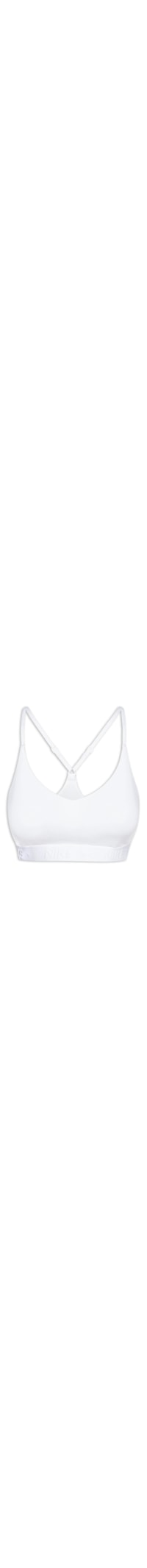 O top branco é confeccionado em malha leve de média elasticidade. A peça justa ao corpo possui decote em V, alças finas reguláveis e cruzadas na parte posterior, barra elástica com nome e logo da marca em alto relevo, forro e bojo removível.