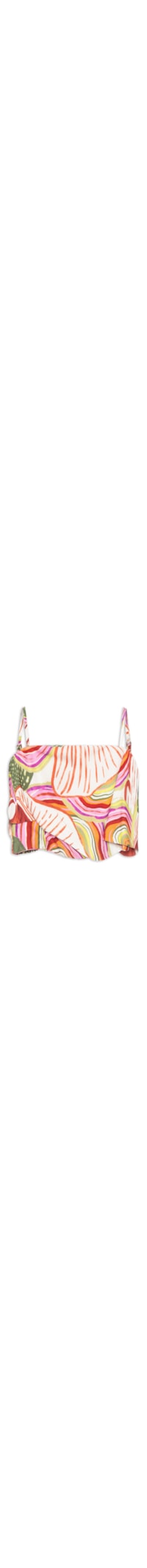 O top verde é confecionado em tecido leve sem elasticidade. A peça justa ao corpo possui decote reto, alças finas e reguláveis, sem bojo, babado com recorte assimétrico na parte frontal e posterior, lastex aplicado na parte posterior, estampa abstrata m cores contrastantes, comprimento curto, sem forro, fechamento posterior por zíper invisível.
