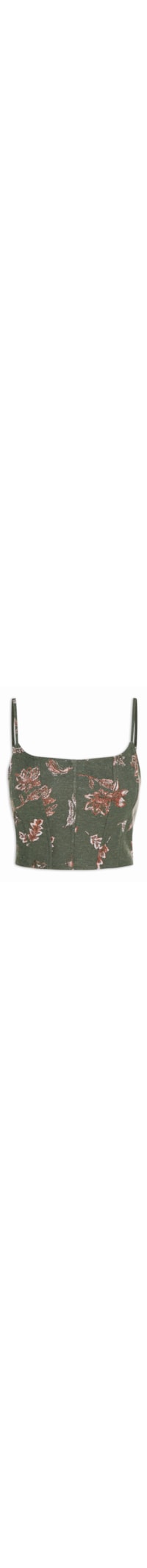 O top verde é confeccionado em tecido leve com superfície em jacquard. A peça possui decote reto, alças finas, cavas regulares, recortes posteriores e frontais, comprimento cropped*, shape justo, caimento reto, acabamento pespontado e fechamento posterior por zíper.