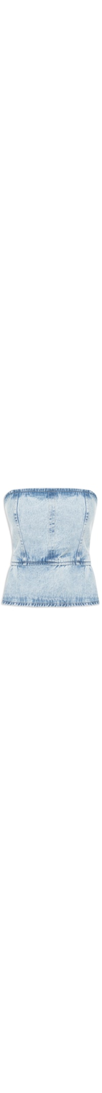 O top azul é confeccionado em sarja com lavagem jeans sem elasticidade. A peça justa ao corpo de modelo tomara que caia possui decote reto, recortes frontais, recorte inferior com aplicação de peplum, efeito estonado, lastex aplicado na parte posterior, tecido duplo e fechamento posterior por zíper.