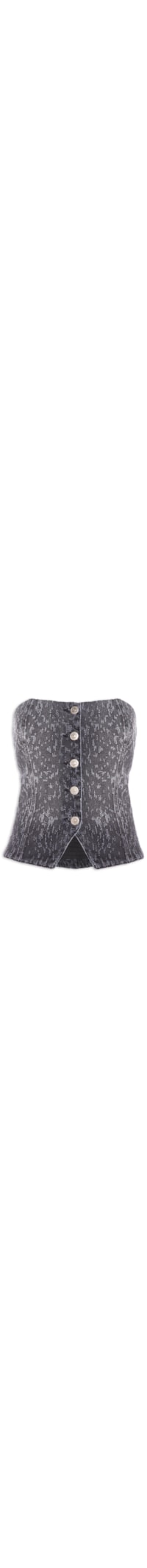 O top preto é confeccionado em sarja com lavagem jeans, superfície texturizada e sem elasticidade. A peça de modelo tomara que caia possui decote reto, recortes nas partes frontal e posterior, recorte vazado na altura da barra frontal, comprimento cropped* e fechamento frontal por botões.