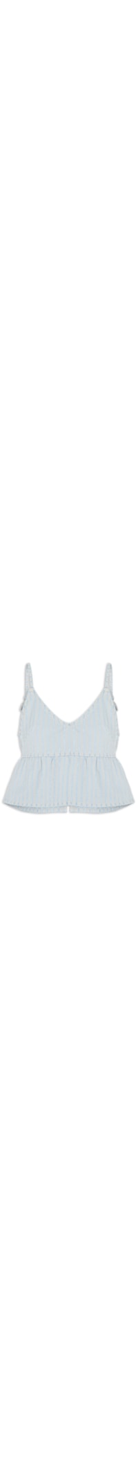 O top azul é confeccionado em sarja com lavagem jeans e sem elasticidade. A peça solta ao corpo possui decote em V, alças finas com regulagem por amarração na parte posterior, padronagem de listras em cor contrastante, recorte frontal e posterior com efeito de babado, abertura posterior com fechamento por amarração e comprimento cropped*.
