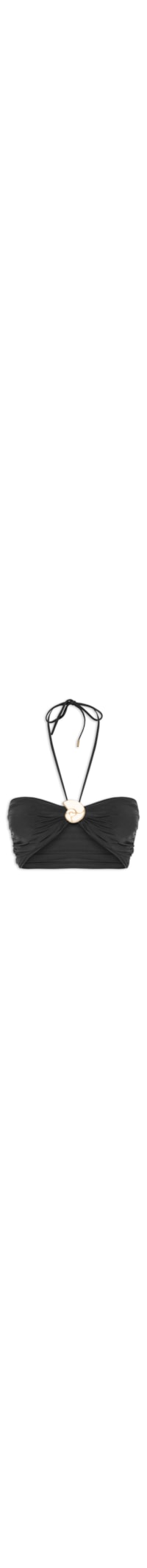 O top preto é confeccionado em tecido leve com média elasticidade. A peça justa ao corpo possui decote halter, alças finas alongadas, efeito franzido na altura do busto, aviamento em formato figurativo de concha aplicado na parte frontal e comprimento cropped*.