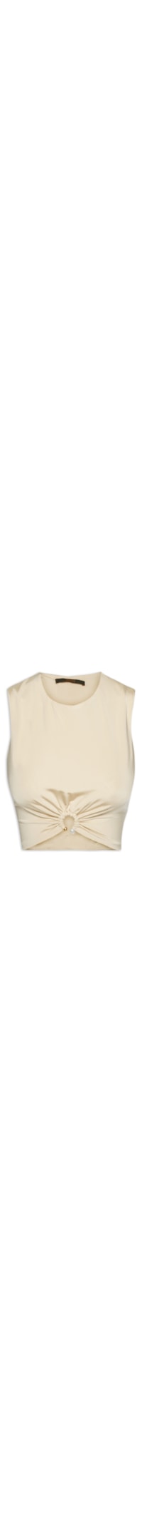 O top bege é confeccionado por tecido leve com baixa elasticidade. A peça justa ao corpo possui decote redondo, alças médias, detalhe em aplicação metalizada frontal e comprimento cropped*.