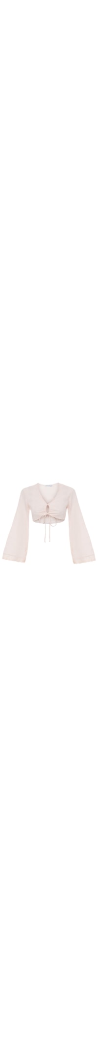 O top nude é confeccionado em tecido de algodão com bordado. A peça possui modelagem justa ao corpo, comprimento cropped, decote V com detalhe vazado, mangas longas modelo sino, punhos com aplicação de laise e fechamento ajustável por amarração frontal.
