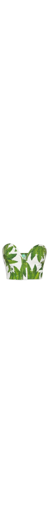O top verde é confeccionado em linho misto sem elasticidade. A peça justa ao corpo, de modelo tomara que caia, possui decote coração, recortes frontais com barbatanas embutidas e acabamento em viés, lastex aplicado na parte posterior, estampa de folhagem em tons contrastantes e forro.