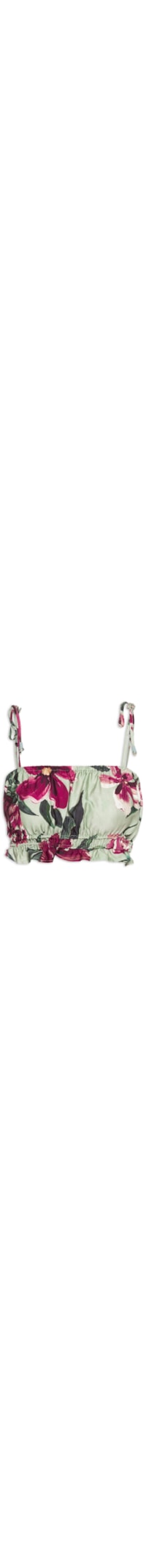 O top verde é confeccionado em tecido leve sem elasticidade. A peça solta ao corpo possui decote reto, alças finas ajustáveis por amarração, estampa floral em cores contrastantes, elástico no decote e na barra, barra com efeito de babado e comprimento cropped*.