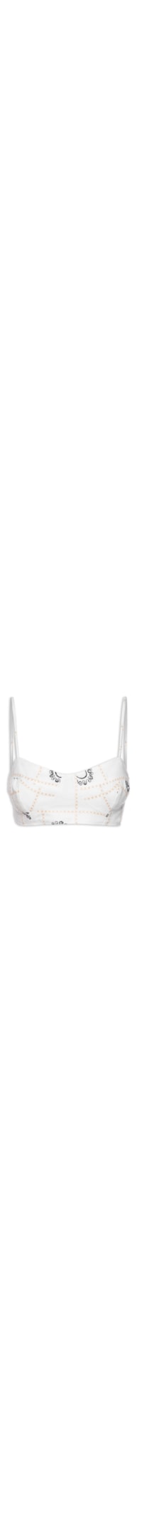O top branco é confeccionado em tecido leve com toque de linho sem elasticidade. A peça justa ao corpo, possui decote coração, alças finas, recortes frontas, alça fina posterior com elástico embutido, bordado figurativo de sol com padronagem xadrez em cores contrastantes e forro.