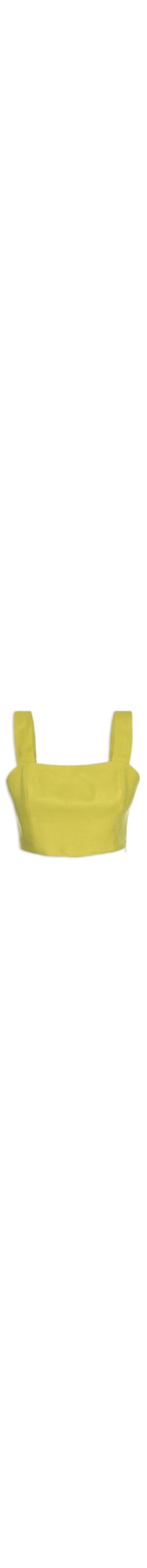 O top verde é confeccionado em tecido leve com toque de linho. A peça possui decote reto frontal e posterior, alças médias com elástico embutido e detalhe franzido na parte posterior, cavas regulares, comprimento cropped*, shape solto e fechamento lateral por zíper invisível.