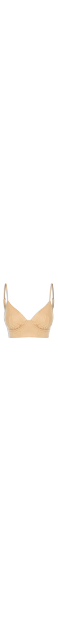 O top bege é confeccionado em tecido leve com toque de linho sem elasticidade. A peça justa ao corpo, possui decote em V, alças finas com regulagem, recortes frontais com leve franzido abaixo do busto, lastex aplicado na parte posterior e forro.