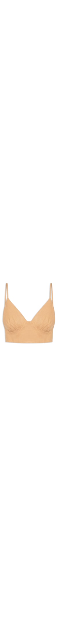 O top bege é confeccionado em tecido leve com toque de linho sem elasticidade. A peça justa ao corpo possui decote v, alças finas com regulagem, lastex aplicado na parte posterior, comprimento cropped* e recorte na parte frontal do busto com efeito franzido.