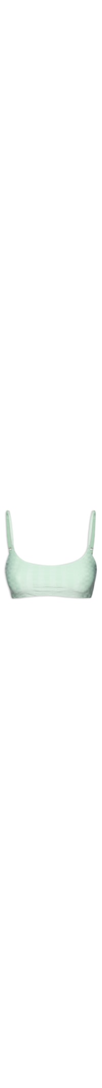 O top verde é confeccionado em malha com superfície texturizada e alta elasticidade. A peça possui decote frontal em U, alças finas reguláveis, cavas regulares, forro, bojo removível e fechamento posterior por encaixe.