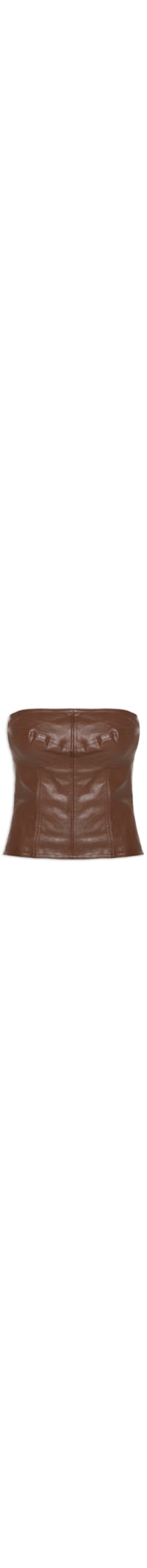 O top marrom é confeccionado em tecido leve sem elasticidade. A peça justa ao busto e ao corpo possui decote tomara que caia, recorte em V frontal, costuras verticais pespontadas, barra levemente aberta e fechamento posterior por zíper.