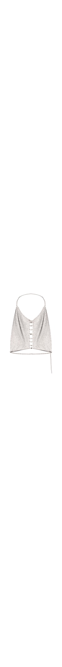 O top preto é produzido em tela com aplicação de strass. A peça solta ao corpo possui decote V, alças finas, aplicação de strass, decote posterior aberto, comprimento cropped* e fechamento posterior por fecho lagosta.