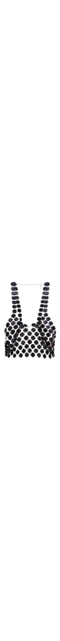 O top preto é produzido em discos de acrílico. A peça solta ao corpo, possui decote em V, alças finas, extensor na parte posterior de corrente metálica, comprimento cropped e fechamento posterior por fecho lagosta.