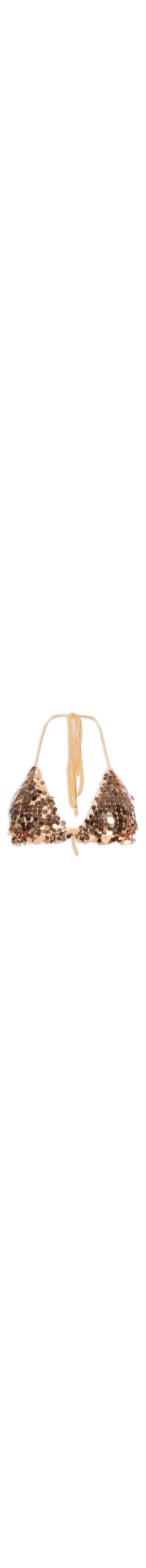 O top dourado é confeccionado em tule com superfície em paetê sem elasticidade. A peça justa ao corpo possui alças e laterais finas, forro, sem bojo e fechamento posterior por amarração.