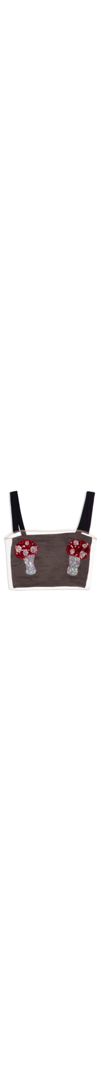 O top vermelho é confeccionado em tule com baixa elasticidade. A peça justa ao corpo possui decote frontal e posterior reto, alças finas em malha com cor contrastante, cavas regulares, transparência, recorte posterior em malha preta com detalhe da tag da marca, transparência, recortes figurativos sobrepostos em cores contrastantes com aplicações de paetês e comprimento cropped*.