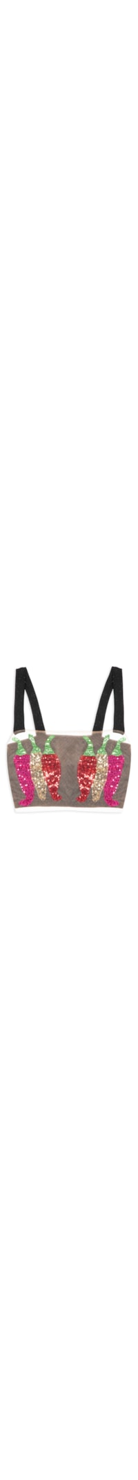 O top preto é confeccionado em tule com baixa elasticidade. A peça justa ao corpo possui decote frontal e posterior reto, alças médias e parte posterior em malha creponada, recortes sobrepostos com formato figurativo de pimentas em paetês metalizados de cores contrastantes, transparência, sem forro e comprimento cropped*.