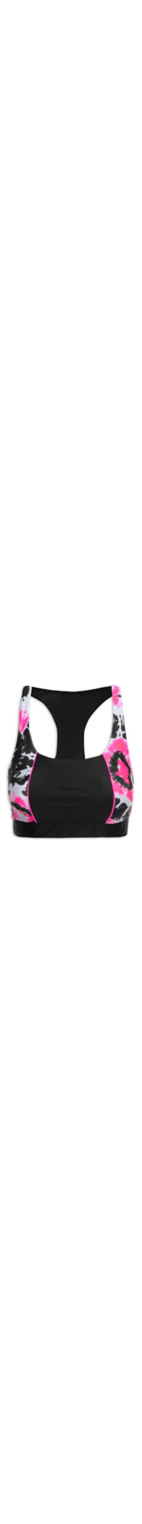 O top preto é confeccionado em malha de poliamida. A peça possui decote U, alças finas, decote nadador na parte posterior, cavas estendidas, recortes frontais com estampa abstrata em cores contrastantes e detalhes de vivos, bojo removível, forro, recorte vazado na parte posterior, faixa elástica embutida na abra, tag da marca aplicada na parte posterior, shape justo, caimento reto e acabamento pespontado.