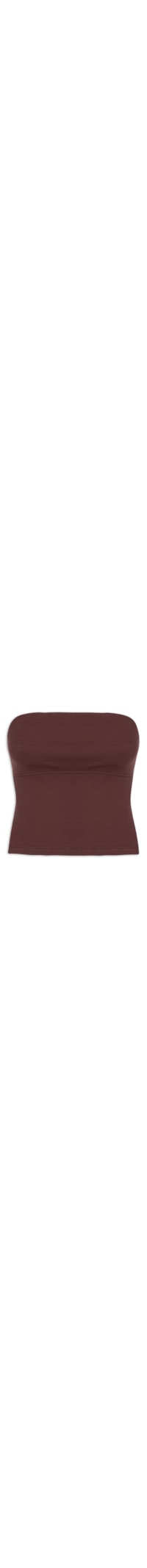 O top marrom é confeccionado em malha leve com superfície canelada de média elasticidade. A peça de modelo tomara que caia possui decote reto com faixa de silicone aplicada na parte interna, recorte frontal com nervura abaixo do busto e meio forro superior.