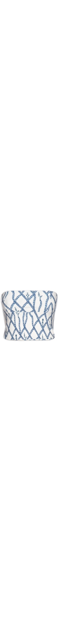 O top off white é confeccionado em malha com média elasticidade. A peça justa ao corpo, de modelo tomara que caia, possui decote reto com elástico embutido, recorte frontal, forro, mix de estampa em cor contrastante e comprimento cropped*.