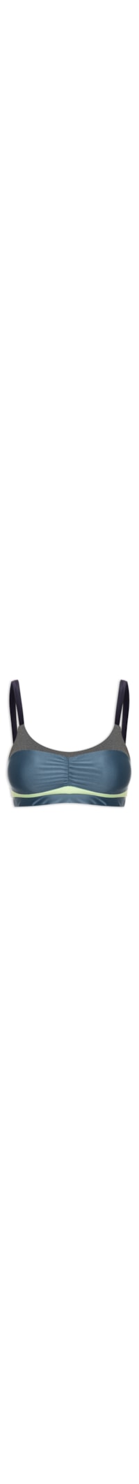 O top azul é confeccionado em malha cirrê. A peça possui decote U e recortes em cor contrastante, alças médias com elástico embutido, detalhes frontais de franzidos, recorte em cor neon na parte frontal e posterior, barra com elástico embutido e tag emborrachada da marca aplicada na parte posterior, bojo removível, forro e shape justo.