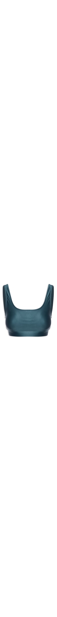 O top azul é confeccionado em malha cirrê. A peça possui decote frontal em U e posterior reto, alças médias, cavas estendidas, bojo removível, forro, barra com elástico embutido e tag da marca de cor contrastante aplicada na parte posterior, comprimento cropped* e shape justo.