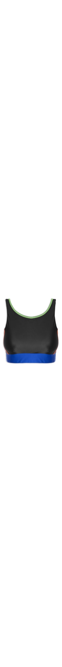 O top preto é confeccionado em malha de poliamida. A peça possui decote redondo, alças médias, cavas regulares, bojo, decote e recortes frontais com acabamento overlocado em cores neon, barra com elástico embutido e tag emborrachada da marca aplicada na parte posterior, comprimento cropped*, shape justo, caimento reto e acabamento pespontado.